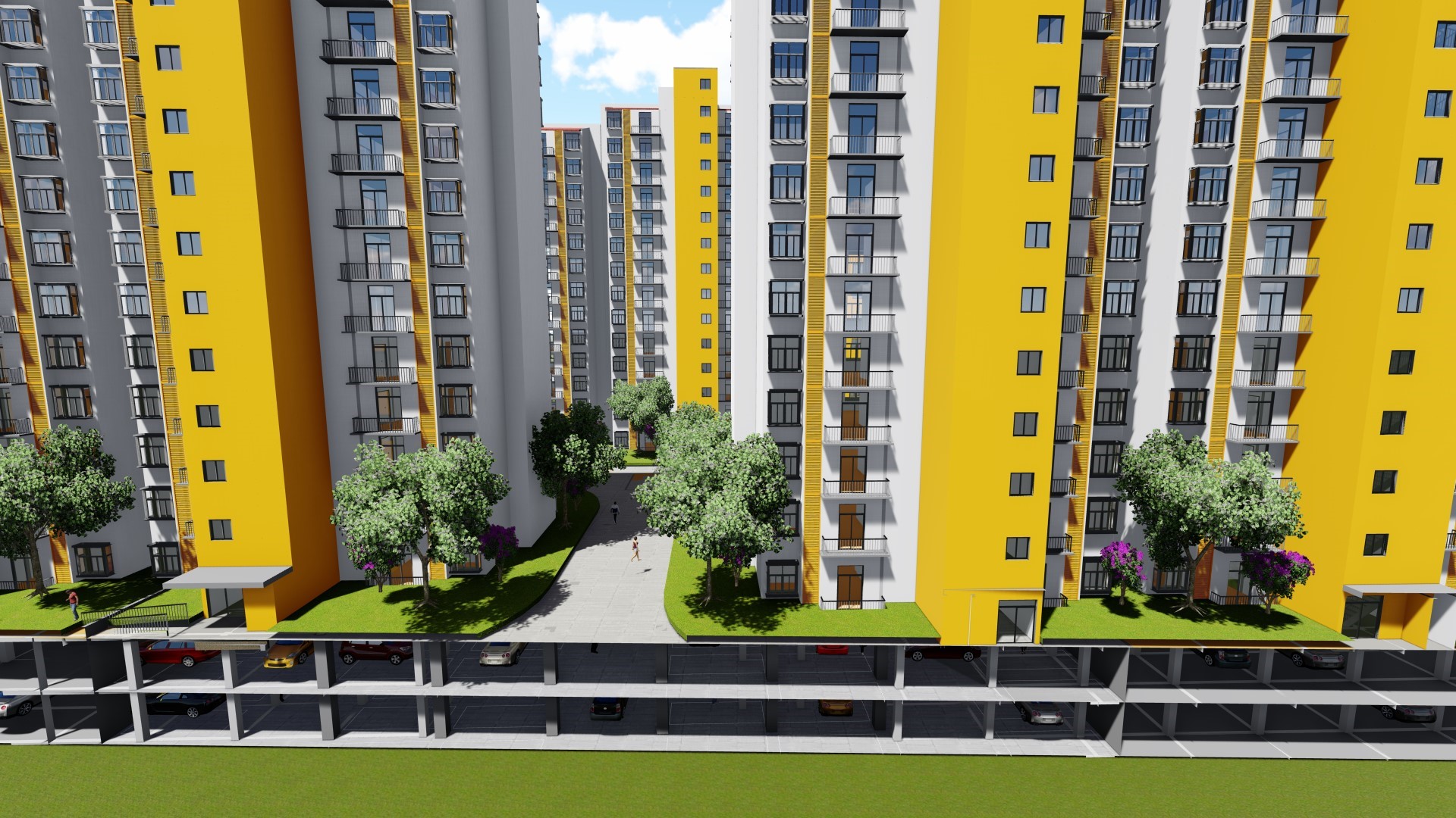 將小區(qū)內(nèi)每棟樓都向上頂升一層或兩層,樓與樓之間用新建框架相連,這樣就形成了一個人為建成的底層大空間,從低層加裝電梯至頂層,這些空間可以用來設(shè)置停車場,托兒所、公共衛(wèi)生間、社區(qū)養(yǎng)老等,沿街的空間可以做商鋪。上部可以修建園林景觀,大樓外觀翻新;