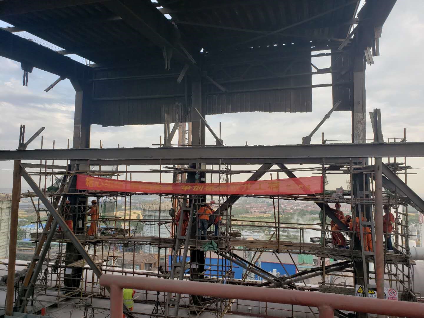 工程中鋼結(jié)構(gòu)框架位于煉鋼廠房最頂層的復(fù)雜環(huán)境,加上煉鋼廠房各層不停產(chǎn),交叉作業(yè)較多,現(xiàn)場溫度高,工作難度非常大。為了確保頂升順利實(shí)施,公司領(lǐng)導(dǎo)對可能遇到的困難高度關(guān)注,從方案討論、圖紙?jiān)O(shè)計(jì)、到施工組織每一步都精心控制。董事長高作平教授親自指導(dǎo)工作,指出鋼滑道頂升既有建筑物是巨成的獨(dú)創(chuàng)核心科技,本工程是該技術(shù)的創(chuàng)新應(yīng)用,務(wù)必做到安全可靠,為鋼滑道頂升既有建筑物規(guī)程的編制積累數(shù)據(jù)。公司派出了強(qiáng)大的設(shè)計(jì)和安全團(tuán)隊(duì)為現(xiàn)場提供有力的技術(shù)支持。在第一個(gè)頂升日中,原計(jì)劃需耗時(shí)一整天頂升量60公分的工作,僅僅用時(shí)兩個(gè)小時(shí)就順利完成。超出了所有人的預(yù)期,獲得了業(yè)主、監(jiān)理等各方的喝彩。頂升工程最關(guān)鍵的是安全問題,項(xiàng)目組在接下來的工作中穩(wěn)扎穩(wěn)打,不畏辛勞,乘勝追擊,在頂升間歇期做好所有焊接和安全工作,至6.1日按計(jì)劃順利完工。