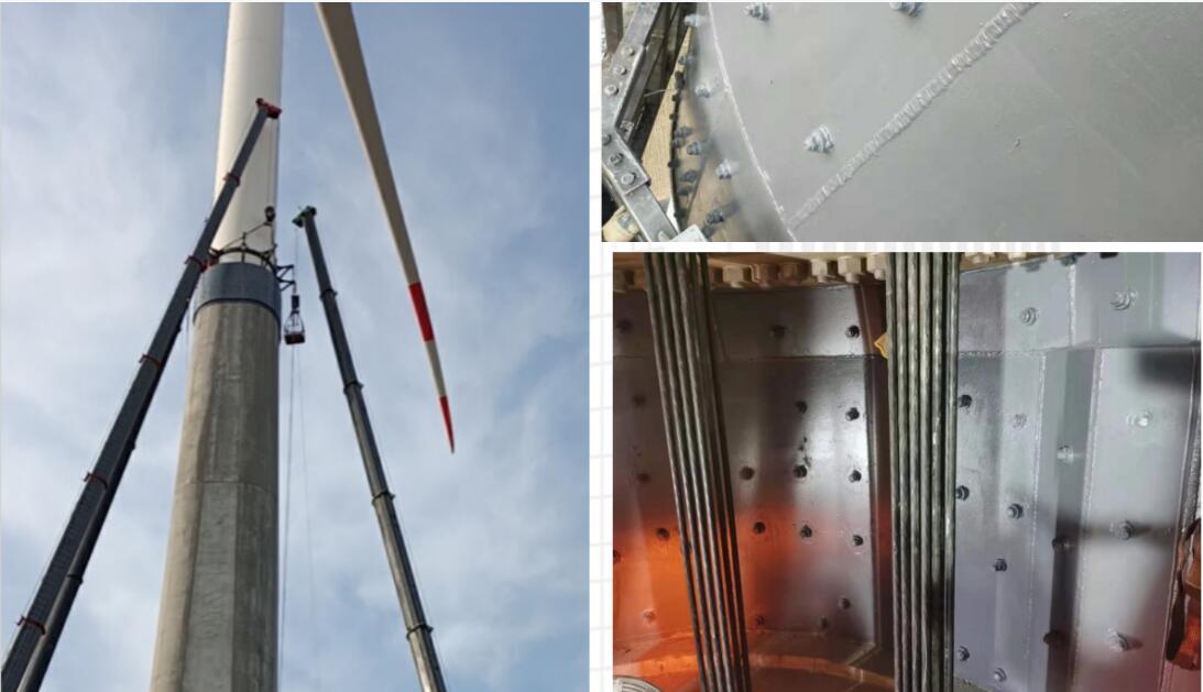 鄄城?電場項?38號、40號機位塔?140m,由4段預(yù)制塔段、轉(zhuǎn)接段、鋼塔段組成,搭載海裝2.5MW葉輪直徑140m?電機組,于2020年11?安裝結(jié)束。2020年10?檢修?員發(fā)現(xiàn)鄄城項?38號、40號機位塔筒轉(zhuǎn)接環(huán)內(nèi)側(cè)區(qū)域出現(xiàn)裂縫及混凝?崩裂現(xiàn)象,外側(cè)區(qū)域嚴重受損,出現(xiàn)混凝???積脫落現(xiàn)象,同時C4段構(gòu)件亦存在不同程度裂縫及混凝?崩裂脫落。本次受委托?要求僅對受損的轉(zhuǎn)接段和第四段塔筒病害進?修復(fù)和補強處理。處理?案為:對轉(zhuǎn)接段內(nèi)外側(cè)外包鋼板并在鋼板與混凝?結(jié)構(gòu)形成的空腔中澆筑?強灌漿料,采?JCZ-MG-20擴孔?鎖錨桿植?原結(jié)構(gòu)與內(nèi)、外側(cè)加固鋼板連接。
