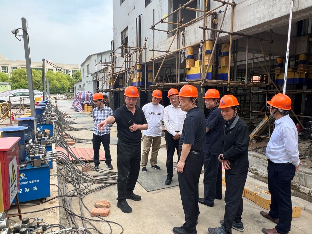 郭生練主席一行參觀了巨成群控同步頂升工程試驗(yàn),聽(tīng)取了巨成副總經(jīng)理張暢對(duì)該項(xiàng)試驗(yàn)的詳細(xì)介紹。領(lǐng)導(dǎo)一行深入到試驗(yàn)現(xiàn)場(chǎng),詳細(xì)了解試驗(yàn)各項(xiàng)創(chuàng)新技術(shù), 并結(jié)合城市更新、水利方面等運(yùn)用提出了很多指導(dǎo)意見(jiàn)和建議。副總經(jīng)理張暢向各位領(lǐng)導(dǎo)介紹了巨成該項(xiàng)技術(shù)目前已經(jīng)成功應(yīng)用在南水北調(diào)渡槽頂升、小區(qū)糾偏頂升、廠房改造等方面。各位領(lǐng)導(dǎo)對(duì)巨成群控同步頂升技術(shù)的創(chuàng)新和對(duì)社會(huì)發(fā)展的巨大意義給予了高度評(píng)價(jià)。