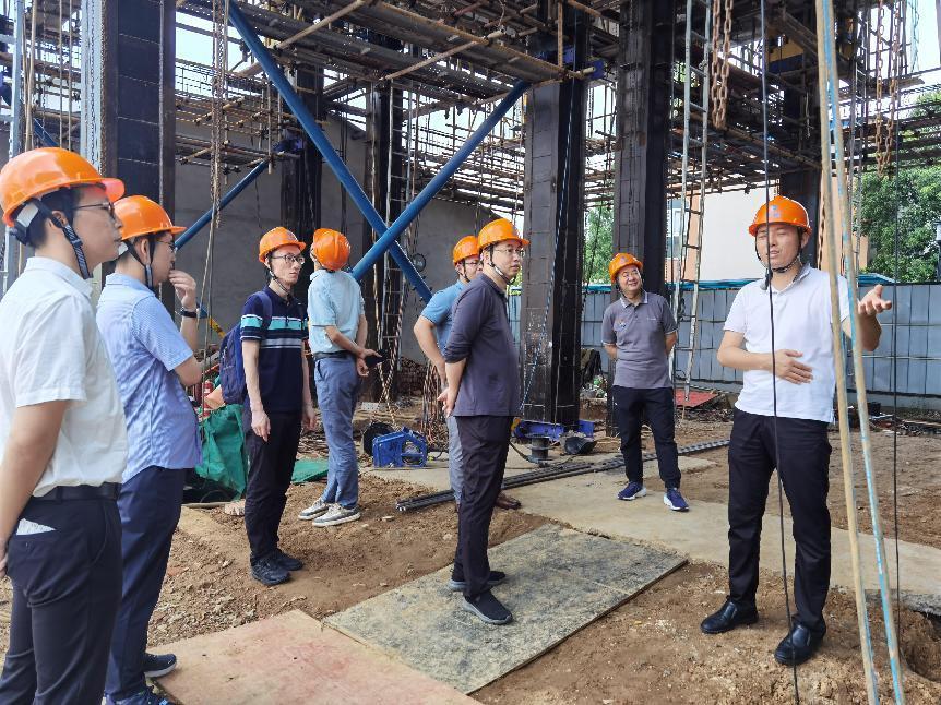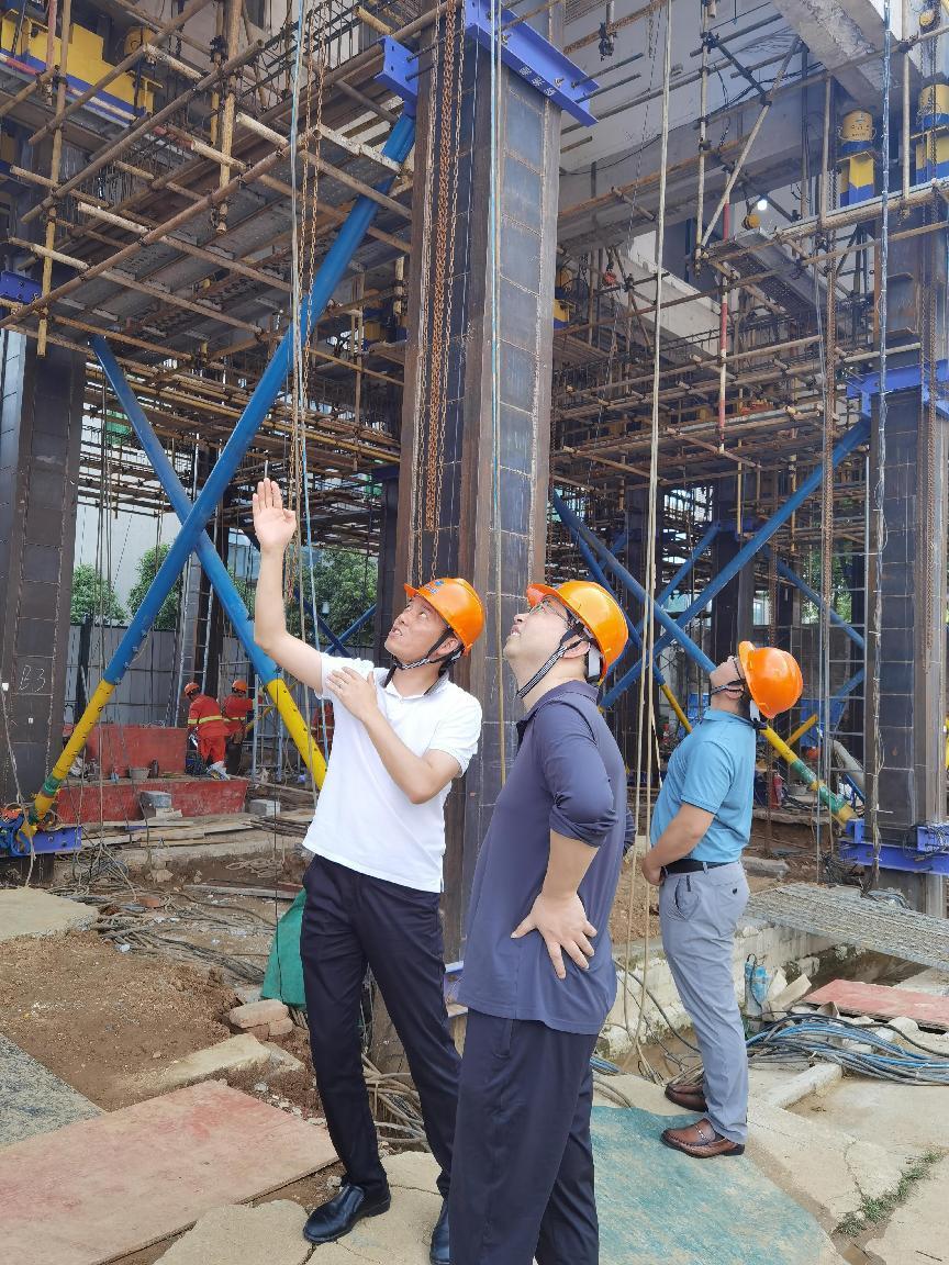 在巨成群控同步頂升工程試驗(yàn)項(xiàng)目現(xiàn)場(chǎng),葛總一行仔細(xì)了解了頂升試驗(yàn)的過程。院長(zhǎng)助理周志勇詳細(xì)介紹了鋼滑道頂升技術(shù)的原理和應(yīng)用。雙方在現(xiàn)場(chǎng)對(duì)技術(shù)細(xì)節(jié)進(jìn)行了深入交流并查看了相關(guān)數(shù)控設(shè)備,葛總對(duì)巨成在研發(fā)上所做的努力和創(chuàng)新表示了極大的認(rèn)可。