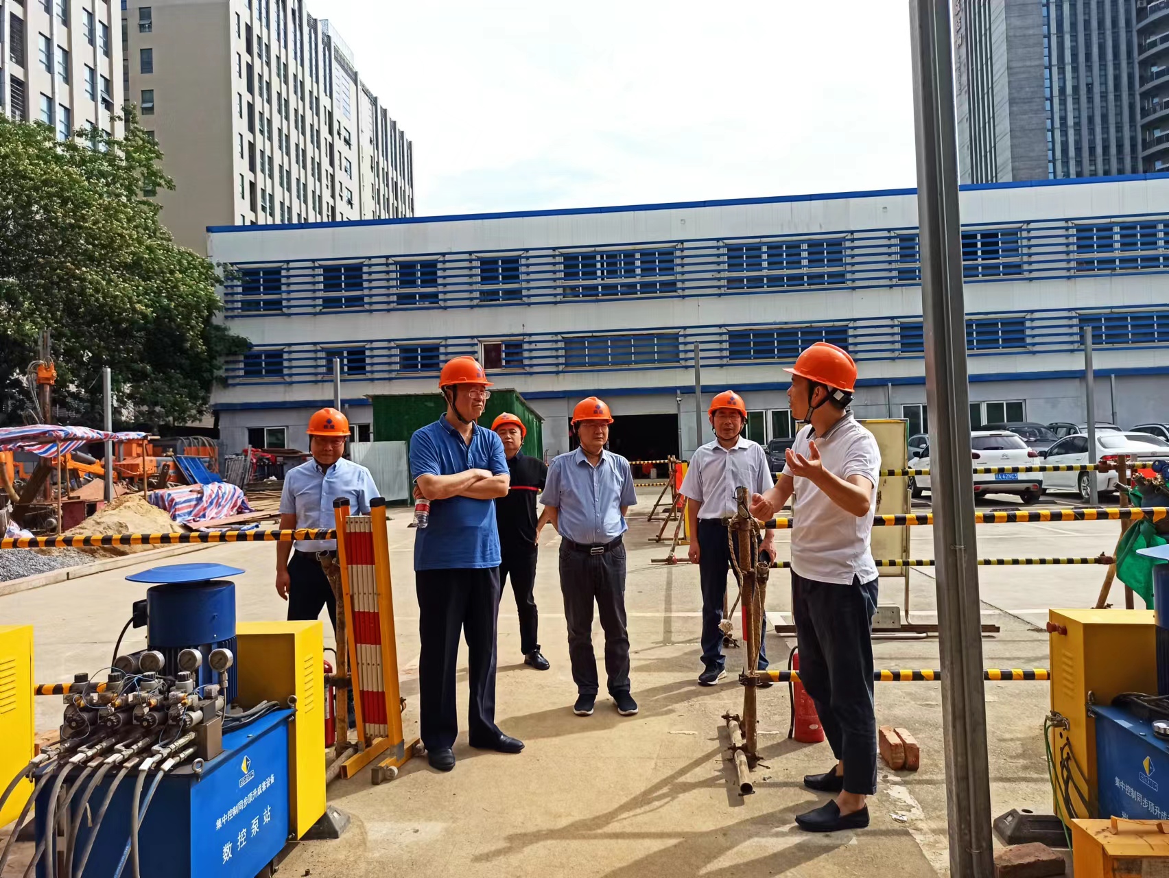 梅院長(zhǎng)一行首先來到巨成群控同步頂升工程試驗(yàn)項(xiàng)目現(xiàn)場(chǎng),巨成研究院院長(zhǎng)助理周志勇介紹了頂升試驗(yàn)的背景、目的和技術(shù)方案。雙方就鋼滑道頂升技術(shù)對(duì)砌體結(jié)構(gòu)頂升增層的設(shè)計(jì)方法和施工技術(shù)展開了交流和討論,特別是對(duì)托盤梁的受力模型進(jìn)行深入探討。大家一致認(rèn)為巨成鋼滑道頂升技術(shù)能夠在城市更新、老舊小區(qū)改造等領(lǐng)域發(fā)揮重大作用。