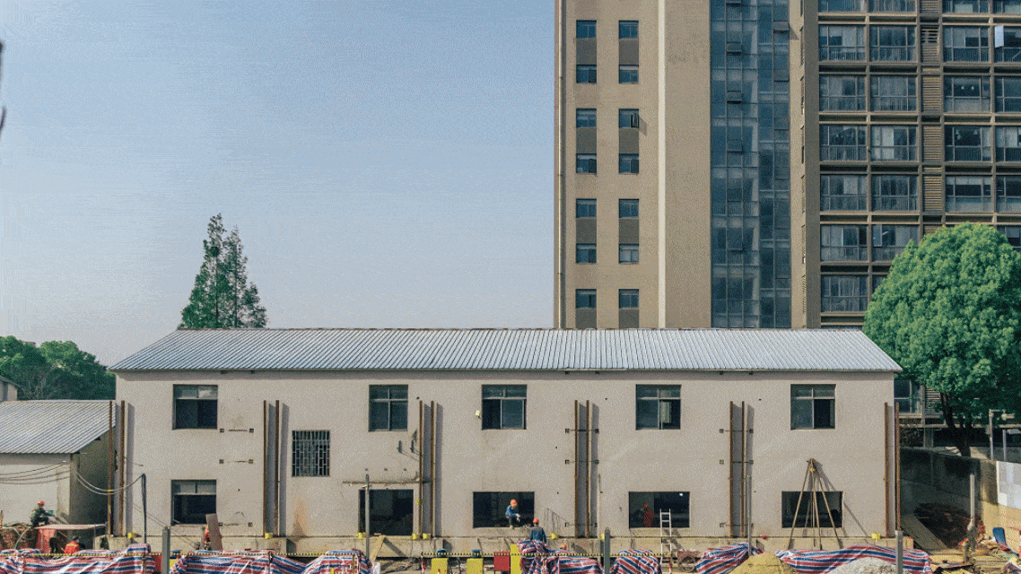 巨成公司于2012年首次提出“鋼滑道”概念,并持續(xù)開(kāi)展鋼滑道頂升技術(shù)研究和產(chǎn)品開(kāi)發(fā)。2021年,巨成公司成功推出了集中控制同步頂升成套設(shè)備;2023年,又將巨成園區(qū)內(nèi)一棟兩層砌體結(jié)構(gòu)樓整體頂升9.3米。